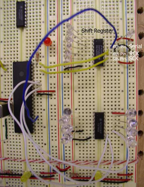 in (pin 14) of register two, and so forth. Also, The clock and latch